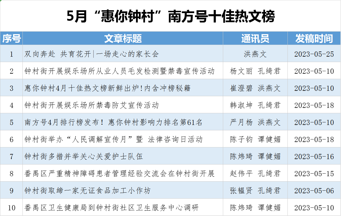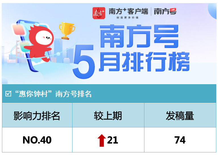 南边号5月名次榜发布!在这次影响力大比拼中,“惠你钟村”南边号排第40名,较上月擢升21名。