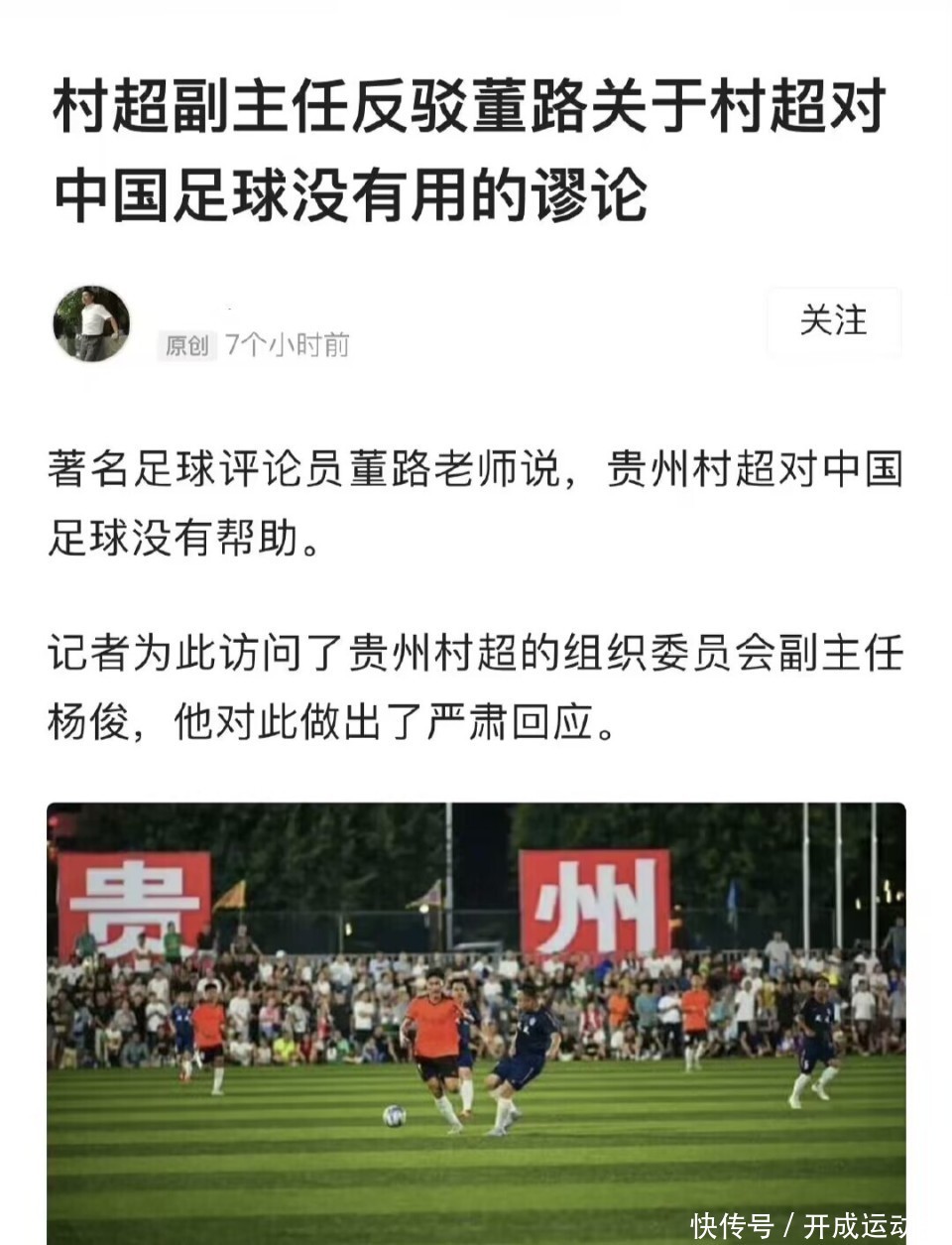 活久见,董路品评“贵州村超足球”,董路示意“贵州村超像跳广场舞”。这是什么指摘?民间足球还需要“董球王指领导点”啦?像跳广场舞如何啦?改动不了什么中国足球如何啦?贵州村超的火爆,震撼了谁的利益?又打了谁的脸?一是中国足协公竖立文调研,二是董路等大V蹭村超热度,真的说来话长。董路直言:像广场舞,村超的话题别聊了,到此终了,他们改动不了什么?